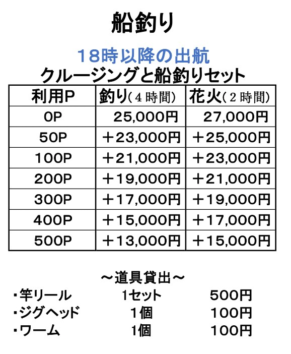 | 時間 | 18時以降「日没後」から出港 出港から釣り終了まで (帰港時間含まず) |